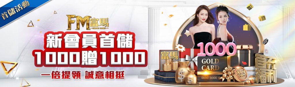 新註冊富馬娛樂城的會員,只要第一次儲值1000元,就直接送你1000彩金,等於帳戶一開始就有 2000元起跳!